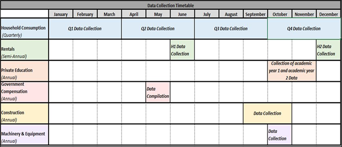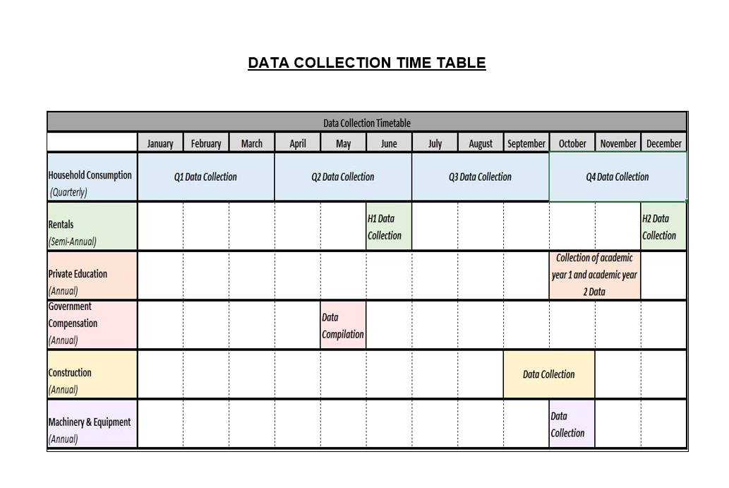 The data collection is required for the following categories: household consumption, machinery and equipment, construction, residential rents, private education, and government expenditure.